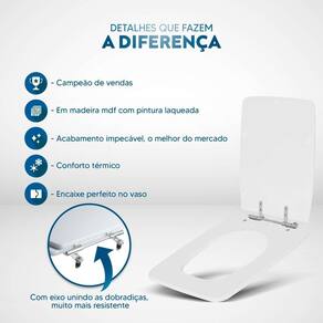 Itens inclusos: assento e tampa em madeira MDF com pintura laqueada. Ferragens metálicas em alumínio anodizado muito resistente, não oxidam e não enferrujam.