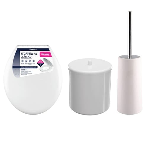 Escova sanitária com suporte base redonda para banheiro A escova sanitária, com sua base em formato circular, é uma solução eficaz para manter sua louça sanitária sempre limpa. Seu cabo de polipropileno e cerdas de nylon proporcionam um alcance superior nos cantos mais complicados do vaso, mas também aumentam a durabilidade do produto. Além disso, vem com um suporte que não só armazena a escova, mas também adiciona um toque decorativo e organizado ao banheiro, com uma tampa elegante em metal cromado. Características - possui tampa em metal cromado - fabricado com materiais de alta qualidade - base redonda oferece firmeza, impedindo que a escova caia ou se movimente - ergonômico simplifica a limpeza dos locais de difícil acesso - nylon resistente que remove sujeiras sem danificar superfícies Especificações técnicas Material: polipropileno Medidas: 10,5 x 1,5 x 37,5cm Cerdas: nylon durável Assento tampa vaso sanitário oval almofadado Este assento sanitário almofadado é preenchido com espuma de poliuretano pu , um material macio e confortável que oferece uma experiência agradável durante o uso do banheiro. Sua tampa envolvente proporciona um acabamento liso e elegante, adaptando-se facilmente a qualquer tipo de banheiro. O assento acompanha um kit para fixação e possui encaixe universal, o que facilita a instalação em qualquer tipo de vaso sanitário. Além disso, possui um suspiro na parte traseira que auxilia na ventilação e reduz a umidade, evitando o acúmulo de odores desagradáveis. Este assento almofadado é ideal para consumidores exigentes que buscam conforto e qualidade em seu banheiro. Sua aparência elegante e design clássico, combinados com sua maciez e facilidade de instalação e limpeza, tornam-no uma escolha atraente para qualquer pessoa. Especificações técnicas Material do almofadado: poliuretano pu Medidas: 44 x 37 x 4cm Distância para fixação dos parafusos: 15cm Acabamento: liso Tipo de vaso: oval Lixeira cesto de lixo 6l com tampa banheiro cozinha O cesto multiuso é um verdadeiro curinga para a organização seja para ser como lixeira ou guardar pequenos itens, este cesto é perfeito para manter a ordem em todos os cantos da sua casa. Seu estilo moderno se encaixa de forma natural em qualquer espaço, ideal para simplificar a organização do seu dia a dia. Com um design inteligente e funcional, este cesto oferece praticidade e estilo em um único produto. Características - superfície lisa e de fácil higienização - multiuso indicado para descarte de lixo ou auxilio na organização - a tampa garante que o conteúdo fique protegido de odores e poeira - ideal para uso em banheiros, cozinhas, escritórios, quartos e demais ambientes Especificações técnicas Material: polipropileno Capacidade: 6 litros Formato: redondo Medidas: 20,6 x 20,6 x 25cm Observação: as cores do produto podem sofrer variações de acordo com o dispositivo, a iluminação do ambiente ou a sua percepção visual. O produto segue montado e pronto para instalação Itens inclusos 01 suporte escova sanitária base redonda 01 assento sanitário almofadado 01 kit para fixação 01 lixeira cesto 6l com tampa redonda