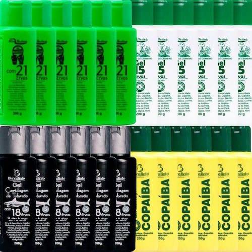 Atacado 24 gel massageador para alívio muscular detonador Este kit contém: - 6 gel detonador com 21 ervas 200g- 6 gel 15 ervas com sebo de carneiro 200g- 6 gel cartilagem de tubarão com 18 ervas 200g- 6 gel massageador copaíba 200g Anvisa: - gel detonador com 21 ervas 200g Aut. M.S.: 2.05121-7Processo nº: 25351.139717/2018-29 - gel 15 ervas com sebo de carneiro 200g Aut. M.S.: 2.05121-7Processo nº: 25351.016851/2012-16 Gel cartilagem de tubarão com 18 ervas 200g Aut. M.S.: 2.05121-7Processo nº: 25351.501220/2013-60 Gel massageador copaíba 200g Aut. M.S.: 2.05121-7Processo nº: 25351.016828/2012-54