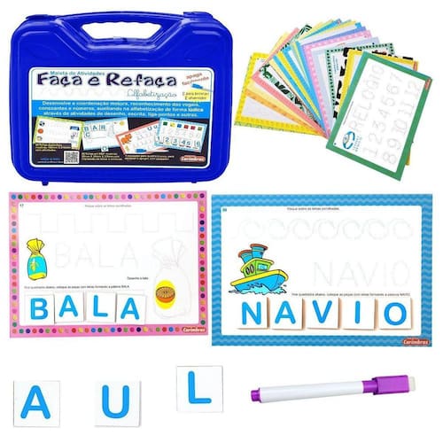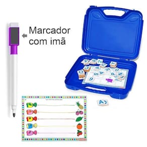 A Maleta Faça e Refaça é o brinquedo educativo perfeito para estimular a alfabetização Com seus 48 desafios em fichas de atividades frente e verso, essa maleta pode ajudar no desenvolvimento de habilidades fundamentais para a educação infantil de forma lúdica. Cada ficha possui aproximadamente 21cm x 15cm e é protegida para não absorver a tinta da caneta inclusa. Acompanhando as fichas, você encontrará 56 peças ilustradas em MDF com o alfabeto e números, proporcionando uma experiência prática de aprendizagem. Indicada para crianças a partir de 18 meses de idade, a maleta é portátil e fácil de transportar, então, se você quer que uma criança se divirta e ao mesmo tempo desenvolva habilidades valiosas, este brinquedo é a melhor escolha Conteúdo da Embalagem: 1 Maleta, 24 Fichas ilustradas Frente e Verso , 56 Peças de Letras e Números e 1 Marcador com Ímã. Certificado de Segurança: CE-BRI/OCP - N 0041-19 NM 300/2002. Ean: 7898017038566
