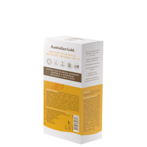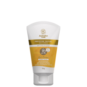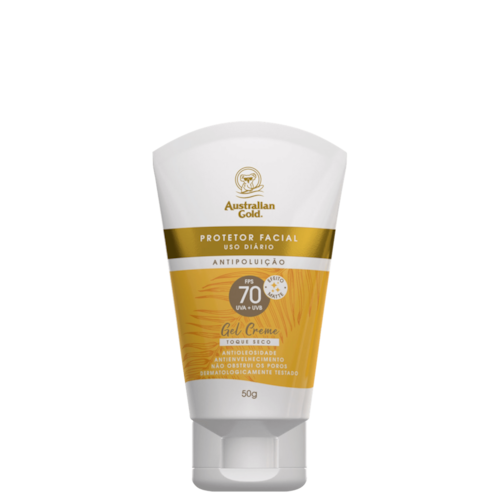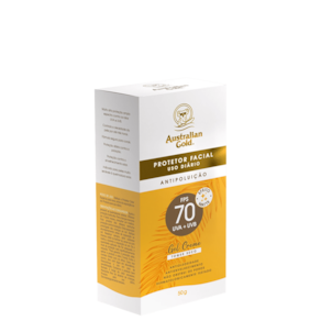 Protetor solar facial para todos os tipos de pele. Australian Gold FPS 70 oferece alta proteção UVA e UVB, toque seco e ação antipoluição, antioleosidade e antienvelhecimento.