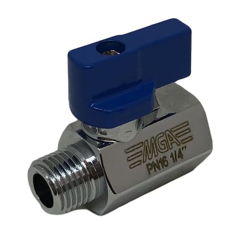 as válvulas de mini são válvulas de bloqueio de fluxo disponíveis em passagem reduzida on/off, isto é, trabalham somente em duas posições, ou totalmente abertas ou totalmente fechadas, com acionamento manual por alavanca, não podem ser utilizadas para regular a vazão do fluido.