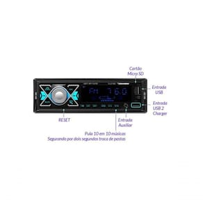 A conectividade é um dos grandes destaques do RS-2714BR Plus. Além de contar com conexão Bluetooth para você reproduzir músicas diretamente do seu smartphone, o auto rádio também possui entrada auxiliar frontal, entrada para cartão micro SD e duas entradas USB dedicadas: uma para recarregar dispositivos e outra para reproduzir arquivos de áudio a partir de um pen drive. Essa combinação de opções permite que você escolha a melhor forma de aproveitar suas músicas e podcasts, sem complicações.