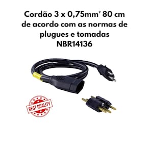 | Cordão | Cordão 3 x 0,75mm 80 cm de acordo com as normas de plugues e tomadas NBR14136 |