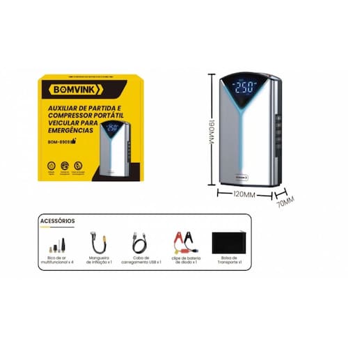 Auxiliar de partida e compressor portatil veicular 8909 Compressor portatil e auxiliar de partida veicular bom-8909 este é um compressor de inflagem multifuncional para carros: oferecendo proteção completa para suas viagens, nosso compressor de enchimento multifuncional para carros é o seu braço direito na estrada. Além de inflar rapidamente o pneu do seu carro, bicicleta, motocicleta e todos os tipos de bolas, esse compressor também é equipado com auxiliar de partida de emergência para garantir que você possa lidar facilmente com qualquer situação. - material durável: feita de materiais de alta qualidade para garantir a durabilidade e a confiabilidade do produto, proporcionando mais tranquilidade ao usá-lo. Adequado para pessoas: - proprietários de veículos que viajam frequentemente de carro - usuários de bicicletas e motos que gostam de esportes ao ar livre - usuários domésticos, que precisam inflar todos os tipos de bolas. - iniciadores de emergência, que precisam fornecer proteção extra para a partida de seus carros compre nossa bomba infladora multifuncional para carros e acrescente segurança e conveniência às suas viagens especificação: pressão do ar: 0-150psi capacidade da bateria: 15000mah entrada da porta type-c: dc5v-2a entrada da porta cc: cc 12-15v/2-6a saída da porta usb: dc 5v/2,4a máx. potência da iluminação led: 20lm cilindro da bomba de ar: 20 cilindros tensão de trabalho: 15v máx. corrente de trabalho: 6a máx. corrente inicial: 400a máx. corrente de pico: 1000a máx. tamanho do produto: 18512065mm peso: 780g lista de configuração: 1 Bomba inflável 1 Partida de emergência para carro 1Acompanha bico para pneu junto a ponta adaptado conforme imagens 1 Bico para bola 1Bico para infláveis 1Bico de pneu rápido 1Cabo de carregamento usb tipo-c. : 90 dias. Marca: Não Informado Ean: 7908782207606