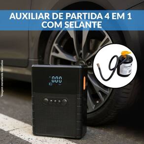 Acessórios incluídos: 1 Auxiliar de Partida, 1 Cabo Carregador Veicular, 1 Cabo Usb, 1 Cabo Tomada 12V, 1 Mangueira, 3 Adaptadores, 1 Selante para Pneu, 1 Bolsa de Transporte, 1 Manual