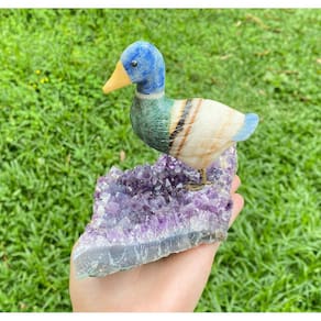 Amostra de Ave esculpida artesanalmente em pedra semipreciosa natural (minerais variados).