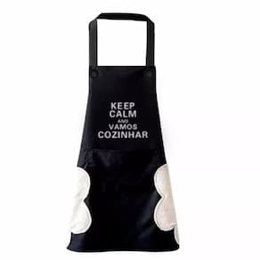 - Qual é a cor predominante do avental? A cor predominante do avental é preto, com estampa.