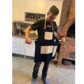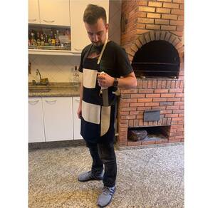 Avental Especial em Jeans Azul e Couro Creme - Brasil Avental feito especialmente para fazer sucesso. Robusto e diferenciado. Junto com seu prazer em fazer churrasco, vocês farão sucesso. Atenção para os detalhes: Um porta faca em couro, uma bolsa em couro e um argola para pendurar toalhas ou luvas. Rebites cobre. Unissex, tamanho Único 74 cm x 57 cm Material: Couro e Lona Marca: Utensilios do Chef