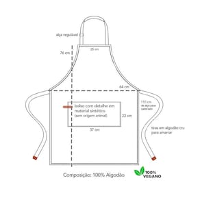 Avental corpo inteiro com tiras de algodao. Alça regulavel no pescoço e ajustavel na cintura com bolso frontal. Ideal para chef de cozinha, barista, jardinagem, pintura e outros. Este avental atende bem aos clientes mais exigentes priorizando conforto, qualidade e estilo. Os detalhes são em material sintético, sem origem animal.