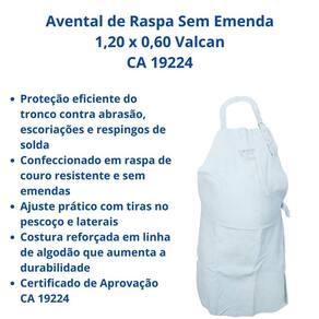 Avental de Raspa Sem Emenda 1,20 x 0,60 Valcan CA 19224 O avental de raspa sem emenda Valcan é confeccionado em raspa de couro de alta resistência, medindo 1,20 x 0,60 m. Possui tiras no pescoço e nas laterais para ajuste, costurado com linha de algodão, garantindo durabilidade e conforto durante o uso. É ideal para proteger o tronco contra agentes abrasivos, escoriações e respingos térmicos em atividades pesadas. Benefícios