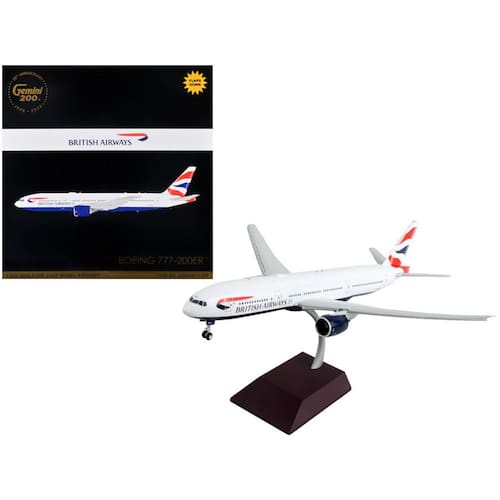 Avião GeminiJets British Airways Boeing 777-200ER – Escala 1:400 (GJBAW2194) O Avião GeminiJets British Airways Boeing 777-200ER – Escala 1:400 (GJBAW2194) é uma miniatura aeronáutica premium, desenvolvida para colecionadores e entusiastas da aviação comercial de longo alcance. Produzido pela GeminiJets, marca mundialmente reconhecida pela excelência em miniaturas de aviões die-cast, este modelo reproduz com alto nível de fidelidade o Boeing 777-200ER, um dos principais widebodies da frota da British Airways, amplamente utilizado em rotas internacionais intercontinentais. Com licenciamento oficial British Airways, a miniatura apresenta pintura autêntica no elegante esquema de cores da companhia britânica, proporções rigorosamente fiéis e acabamento detalhado em fuselagem, asas e motores. A escala 1:400 é uma das mais populares entre colecionadores, sendo ideal para aeroportos em miniatura, vitrines compactas e grandes coleções de aviação comercial, mantendo excelente nível de detalhes mesmo em tamanho reduzido.