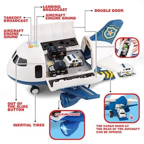 Conjunto de carro e avião: 1 avião, 1 tapete de jogo, 4 carros, 1 helicóptero, 11 placas de estrada. - Supervalor: 4 carros de polícia fundidos e 1 tapete de brinquedo da vida urbana e 1 brinquedo de helicóptero e 11 sinais de trânsito e funções em um avião de transporte. Enriqueça o jogo e estimule a imaginação do seu filho. - Muita diversão: empurre levemente os brinquedos movidos a fricção, durarão por longas distâncias, pressione o botão acima do avião, você pode ver as luzes brilhantes piscando e ouvindo o som do avião decolando ou a transmissão do aeroporto. Requer 3 pilhas AA (não incluídas). - Tapete infantil divertido: se o seu filho gosta de carros, caminhões e edifícios, ele vai adorar este tapete de brincar. Coloque diferentes placas de trânsito e carros no tapete, esta é uma boa maneira de ensinar ao seu filho os vários locais e o sistema educacional de tráfego rodoviário para crianças. - Brinquedos de avião de alta qualidade: este conjunto está em conformidade com os padrões de brinquedos dos EUA. Feito de metal e plástico de alta qualidade livre de toxinas. Uma escolha muito resistente e durável para seus filhos. E o tapete de 57 x 83 cm feito de tecido não tecido impermeável e antirrugas, à prova d'água, não desbota e é forte. - Presente ideal para crianças: este conjunto de brinquedos é embalado em uma linda caixa de presente. Ótimo para áreas de jogos, sala de jogos, quarto, jardim de infância, escola primária, creche, etc. Um presente perfeito para aniversário, Natal, dia das crianças etc.