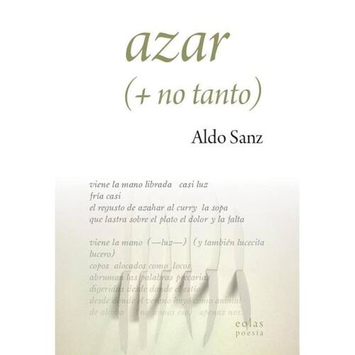 El último libro de Aldo Sanz, azar (+ no tanto) puede ser leído como una sucesión de estampas más o menos difuminadas por el paso, el correr, el olvido, la deformación del tiempo, como se prefiera. Confluyen, en su brevedad, temas recurrentes de su última poesía, como la presencia de Antón Makarenko (posible símbolo de disciplina paterna) o la de T. S. Eliot, símbolo más complejo y ambiguo, polisémico en todo caso.Al mismo tiempo instala su escritura en distintos planos, tanto espaciales como temporales, planos que bien pudiéramos llamar «cubistas», a la manera de «El músico de Saint-Merry», célebre poema de G. Apollinaire.Juego de espejos o catálogo de alucinaciones controladas son otras posibles lecturas que nos acercan (y cercan) a la poética de Aldo Sanz.La clave final, como siempre, la urdimbre certera la pondrá el lector con su lectura, que es el lugar donde se terminan de escribir todos los poemas.C.Z. Marca: BIBLIOMANAGER