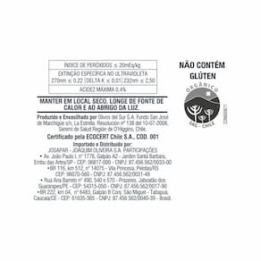 O Azeite Nova Oliva Orgânico, é um azeite gourmet com toque levemente frutado que, além de delicioso, respeita o meio ambiente. Obtido através de azeitonas de variedades Frantoio, Leccino, Coratina e Arbequina, responsáveis pelo aroma único de amêndoa madura e tomate. Indicado para acompanhar qualquer refeição. O produto tem acidez máxima de 0,2%.