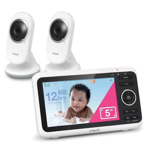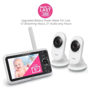 Tela de alta resolução de 5 com 2 câmeras Veja claramente cada pequeno movimento do seu bebê enquanto lava a louça ou da cama. A tela LCD de alta resolução mostra imagens em cores durante o dia e imagens infravermelhas em escala de cinza à noite, brilhantes e claras sem E se você precisar ver de perto a câmera aumenta o zoom 2x. Com 2 câmeras, você pode escolher como deseja ficar de olho em sua família visualização única, visualização em tela dividida ou modo de patrulha. Melhor duração e alcance da bateria da categoria Com até 12 horas de transmissão de vídeo, até 21 horas de monitoramento somente de áudio, com uma única carga, este sistema permite monitorar seu bebê durante a noite com facilidade. O longo alcance de operação confiável do sistema de até 304 m, permite que você continue o seu dia e permaneça conectado com seu bebê de outra sala ou mesmo do quintal. Privacidade garantida. Sem Wi Fi ou emparelhamento de aplicativos Com a confiança das famílias dos EUA há mais de 3 décadas, cada monitor VTech é transmitido por meio de um canal interno de 2,4 GHz com tecnologia FHSS, para que você possa ter certeza de que é o único que pode ouvir e ver seu bebê