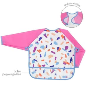 Possui bolso pega migalhas, ideal para proteger a roupinha do bebê.