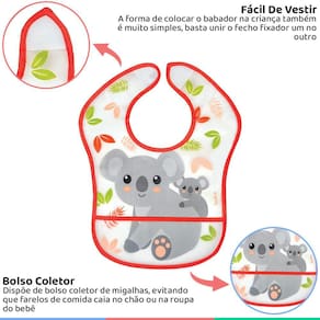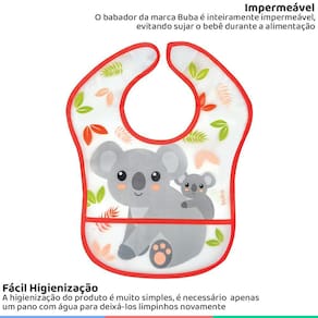 Quando falam em introdução alimentar, as mamães já pensam logo na bagunça e sujeira que os pequenos fazem! Por isso o babador da marca Buba é o amigo perfeito para essa fase, pois com ele os bebês podem explorar os alimentos sem a preocupação de manchar as roupinhas, afinal, é necessário um pano com água para deixá-los limpinhos novamente. Com um material confortável e higiênico, ele também é dobrável e dispõe de um bolso coletor de migalhas e um fecho com tiras autocolantes que não acumula sujeira.
