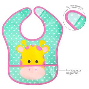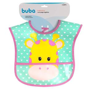 Babador com bolso 3m+ 15367 pega migalhas Personagens: girafa O babador impermeável buba é ideal para as mamães que querem praticidade e leveza no dia a dia das crianças. Possui tecido impermeável que facilita a limpeza e protege o bebê dos respingos da alimentação. A mamãe poderá manter a roupinha do seu príncipe ou princesa sempre limpinha vem com bolso na posição frontal que serve como cata migalha evita o desperdício durante as refeições. Possui fecho colante que se ajusta ao pescoço do seu bebê. com suas cores alegres e estampas divertidas, os babadores buba farão do momento da refeição uma ocasião mais felizInformações técnicas- idade recomendada: a partir dos 3 meses 3m+ ;- com bolso frontal para reparar as migalhas nas refeições; - fechamento com fita tipo adesivo colante;- tecido impermeável e leve- praticidade para limpeza e proteção para seu bebezinho;- dimensões aproximada do produto: 30cm x 24cm x 0,05 cm c x l x p - embalagem contém 1 babador com bolso;- composição: frente 100% acetato de vinil de polietileno peva