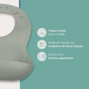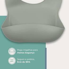 O Babador de silicone com pega-migalhas é projetado para uso por bebês a partir de 6 meses de idade e conta com 4 ajustes de tamanho na altura do pescoço. Ele ainda é super prático na hora da limpeza, podendo ser lavado na máquina de lavar louças.