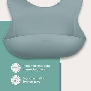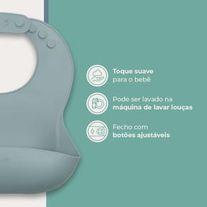 O Babador de silicone com pega-migalhas é projetado para uso por bebês a partir de 6 meses de idade e conta com 4 ajustes de tamanho na altura do pescoço. Ele ainda é super prático na hora da limpeza, podendo ser lavado na máquina de lavar louças.