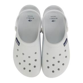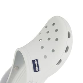 O enfeite em plastisol simula uma etiqueta com costuras em volumetria, e a tampografia no calcanhar com o logo da marca reforça a pegada institucional desse produto. Para completar, vazados na lateral do cabedal proporcionam maior arejamento para o calce.