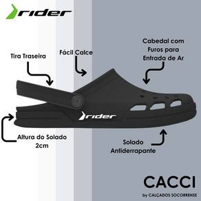 Babuche Masculino Rider feito em material sintético de alta qualidade, obtendo seu solado antiderrapante que proporciona segurança em superfícies escorregadias. Com uma alça traseira garantindo um ajuste seguro e confortável.