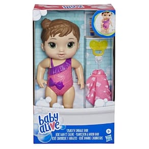 A Baby Alive Bebe Banhos Carinhosos Morena, da Hasbro, é a companheira perfeita para brincar de dar banho. Essa boneca interativa pode ser submersa na água para simular um banho realista. Além disso, ela vem acompanhada de uma chupeta e uma toalinha para deixar a brincadeira ainda mais completa.
