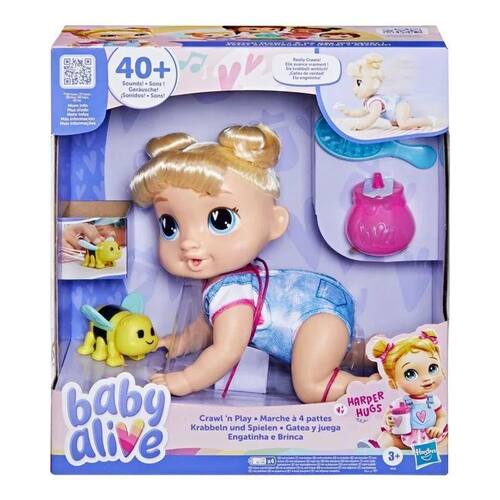 Baby Alive Crawl N Play Harper Abraços F9709 . Esta boneca interativa produz muitos efeitos sonoros fofos, como ficar animada para engatinhar, comer e rir enquanto avança. Pegue-a e pressione e segure o botão nas costas para iniciar uma melodia musical de 12 segundos para fazer seus braços e pernas se moverem como se ela estivesse dançando. Role a abelha de brinquedo pelo chão e observe suas asas subirem e descerem. Inclui: brinquedo abelha rolante, copo e escova.
