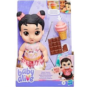 É hora do lanche com a boneca Baby Alive Katie Kat Com 28 cm, braços e pernas articulados e cabelo preto moldado, ela vem pronta para muita diversão comidinha. Inclui babador removível, uma barra de chocolate e um sorvete mágicos que simulam mordidas quando pressionados contra a boca da boneca, diversão sem bagunça e com mordidas que desaparecem e reaparecem quantas vezes quiser A roupa com estampa de sorvete é removível, e o corpo rígido permite que ela fique sentada ou em pé. Ideal para crianças a partir de 3 anos, essa boneca incentiva o faz de conta, desenvolve empatia e estimula a imaginação. Uma excelente opção de presente para meninos e meninas que adoram cuidar e brincar de comer com seus bebês de mentirinha Fabricante: Hasbro Ref.: G1450 Código Barras: 5010996340856 Idade recomendada: Acima de 3 Anos Dimensões da Embalagem AxLxC : 34X23X10cm Peso:510g do Vendedor: 7 dias do Fabricante: 3 meses Homologação Inmetro: CE-BRI/IQB 000446 52977/19-025 Marca: Não Informado