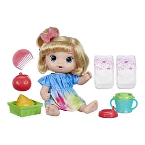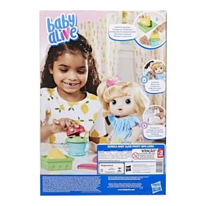Com o kit Baby Alive Hora do suco, as crianças podem brincar de fazer sucos para a boneca e alimentá-la com a mamadeira incluída. Vem com uma máquina de sucos de mentirinha e 2 frutas de plástico (maçã e abacaxi). As crianças podem mergulhá-las na água e depois espremer na máquina. Vem também com uma cesta de frutas. Basta trocar a tampa da máquina de sucos com a tampa da mamadeira para poder alimentar a boneca. Depois do suquinho, é hora de trocar a fralda (fraldas para bonecas adicionais vendidas separadamente). Esta boneca Baby Alive para crianças a partir dos 3 anos vem com roupa inspirada em fruta. Excelente presente de aniversário ou outras celebrações, esta boneca inclui pente e presilha.Especificações: Fabricante: HasbroRef.: F7356Cód. Barras: 5010996100467Idade recomendada: +3 anos.Dimensões da embalagem (AxLxC) 37x25x10 cmPeso: 0,718 kgGarantia do vendedor: 7 diasGarantia do fabricante: 3 meses