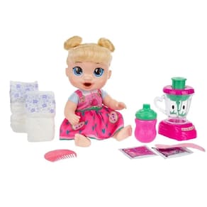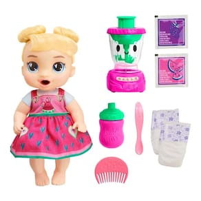 Prepare um lanche mágico com a Harper Hugs e o conjunto Baby Alive Sweet Smoothies! O kit inclui um liquidificador de brinquedo funcional, que realmente mistura a comidinha para Harper comer. Basta adicionar um dos 2 pacotes de comida inclusos com água, apertar o botão no topo do liquidificador e ver a mágica acontecer. A boneca come de verdade quando alimentada com o smoothie! Depois do lanchinho e da água, é hora de cuidar da Harper: troque a fralda e penteie seus cabelos macios. Ela vem vestida com roupas removíveis e inclui ainda colher, garrafinha e 2 fraldas para completar a brincadeira.