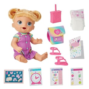 Conjunto de bonecas Baby Alive Time for School, 12 polegadas, brinquedos de volta às aulas para meninas e meninos, cabelos loiros, presentes pré-escolares para crianças de 3 anos ou mais (exclusivo da Amazon) — PREPARE-SE PARA O PRIMEIRO DIA: arrume sua mochila com tudo o que ela precisa para se divertir de volta às aulas. Dê a ela uma bebida e troque as fraldas também - ELA TEM AULA: finja a escola com estilo com roupas modernas de boneca, com um adorável suéter e sandálias (ambas removíveis) - ADESIVOS E PLANILHAS: acessórios para bonecas com tema escolar aumentam a diversão com 3 planilhas coloridas do tamanho de uma boneca que cabem na pasta e na mochila. Também podem ser decoradas com adesivos - BEBIDAS E MOLHOS: ela realmente bebe do acessório da caixa de suco e depois molha a fralda Baby Alive - BONECA DE 12 POLEGADAS: esta boneca Baby Alive com cabelo tem o tamanho certo para levar para qualquer lugar, com pernas e braços dobráveis. Ótimo presente para crianças — LET'S PLAY SCHOOL: conjuntos de bonecas e brinquedos pré-escolares, como Time for School Baby, são ótimos presentes de Natal, aniversário ou volta às aulas para meninas e meninos de 3 anos ou mais