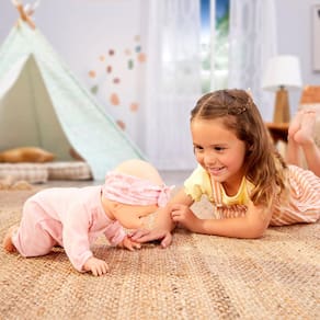 - ENGATINHA SOZINHA: Ela engatinha sozinha, imitando a experiência da vida real de um bebê engatinhando. Basta colocá-la em uma posição de engatinhar e ela começará a se mover pelo chão, com adoráveis sons e movimentos de engatinhar.