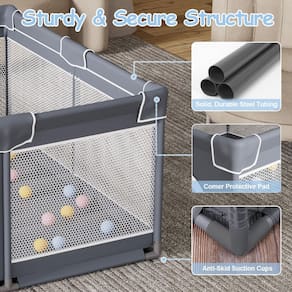 Cercadinho para bebês com tapete - Cercadinho para bebês e crianças pequenas com tapete: este produto inclui um tapete de brincar e uma bolsa de armazenamento. O cercadinho para bebês de 50* 50 polegadas oferece uma área segura e espaçosa para os bebês engatinharem, ficarem em pé e brincarem livremente, promovendo a exploração e o aprendizado. - Materiais ecológicos e de alta qualidade: nosso cercadinho com tapete usa materiais que atendem aos padrões de segurança dos EUA (certificados CPSC e ASTM). O tecido é durável e fácil de limpar, feito de tecido Oxford de alta qualidade. - Design de visibilidade total de 360°: o design de malha respirável permite que os pais monitorem seu bebê de qualquer ângulo, garantindo tranquilidade. A porta externa com zíper permite que você interaja com seu bebê, proporcionando uma sensação de segurança. - Baby Safety Play Yard: ventosas de segurança robustas na parte inferior do cercadinho evitam que tombem. As almofadas de canto macias minimizam os choques acidentais, enquanto o tapete de brincar com absorção de choque garante a segurança do seu bebê. - Fácil de instalar e transportar: você pode configurar rapidamente o cercadinho sem ferramentas ou etapas complicadas. Ele vem com uma bolsa de armazenamento para armazenamento conveniente quando não está em uso, mantendo-o compacto e fora do caminho.