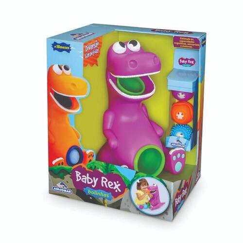 Marca, Adjomar Modelo, baby Rex Bolinhas Cor, roxo ou laranja conforme disponível em estoque Dimensões, A x L x P 37 x 15 x 17 cm Idade Recomendada, à partir de 18 meses Composição da Embalagem, 01 Baby Rex, 03 bolinhas com chocalho