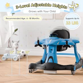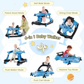 Xilingol Andador de bebê 6 em 1, andador de atividade de altura ajustável com assento acolchoado, andador infantil com rodas, andador de bebê dobrável para meninos e meninas - Design conversível 6 em 1: este andador de bebê versátil é projetado para bebês de 6 a 18 meses, ajudando-os a aprender a andar e fortalecendo os músculos das pernas. Ele transita através de seis modos: modo de assistência aos pais, modo de caminhada automática, modo cadeira de jantar, modo push walker, modo carrinho de empurrar e modo avião de brinquedo. O design envolvente do avião atende a várias necessidades de desenvolvimento e mantém seu bebê entretido. - Conforto para bebês: o andador oferece 3 posições de altura ajustáveis, permitindo que ele cresça com seu bebê e apoie seu desenvolvimento em diferentes estágios. A almofada de assento curvada evita pernas em forma de O e é removível e lavável para facilitar a limpeza. Feito de material PP respirável de alta qualidade, garante conforto e segurança para o seu filho. - Segurança confiável: Certificado pela ASTM e CPSIA, este andador de atividades para bebês garante a máxima segurança. Possui um amortecedor de segurança protetor para proteger a cabeça do seu bebê de colisões e um encosto alto ergonômico para suporte ideal da coluna. Cinco almofadas antiderrapantes evitam quedas e escorregões, e o amplo espaçamento das rodas garante um movimento estável e seguro. - RODAS FLEXÍVEIS E AJUSTÁVEIS: Equipado com 4 rodas universais lisas e silenciosas, este andador garante movimento flexível sem perturbar os membros da família. As rodas traseiras podem ser ajustadas para velocidade: gire no sentido anti-horário para um movimento mais rápido, no sentido horário para movimentos mais lentos, ou bloqueie-as para maior segurança. As rodas dianteiras giratórias de 360° proporcionam direção sem esforço. - Centro de atividades interativas: com controles de avião realistas, como volante, câmbio, espelhos retrovisores e botões de luz, este andador oferece uma experiência de pilotagem autêntica para o seu bebê. Música vívida e luzes estimulam os sentidos do seu filho, tornando a brincadeira divertida e educativa. O painel de controle removível funciona como um brinquedo independente ou bandeja de jantar. - Fácil de guardar: quando não estiver em uso, o andador se dobra em um tamanho compacto para facilitar o armazenamento sob o sofá ou cama. Seu design leve e dobrável o torna conveniente para viagens, garantindo que seu bebê possa desfrutar de seu centro de atividades favorito em qualquer lugar. Combinando funcionalidade com diversão, é perfeito para uso doméstico e em movimento.