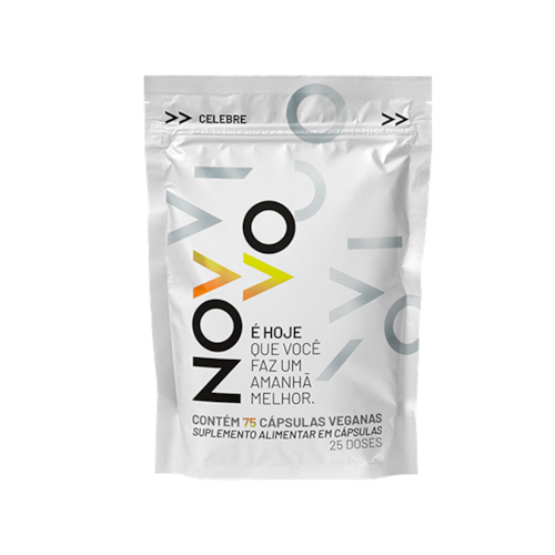 A Bag da Novvo consiste em uma única embalagem que contém zip lock com 25 doses (75 cápsulas) do Novvo Pré-Drink.