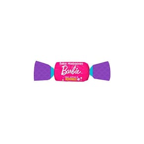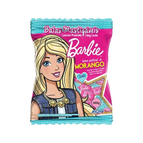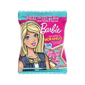 Pacote contendo aproximadamente 120 unidades de bala mastigável sabor morango com tema da Barbie. Peso total da embalagem 600 gramas.