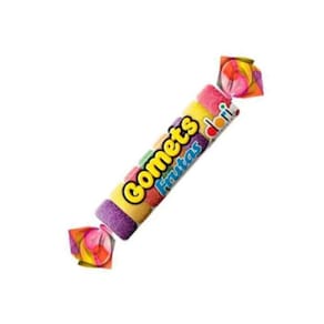 Caixa contendo 30 unidades de tubo com balas de goma sabor frutas Gomets com 32 gramas cada. Peso total da embalagem 960 gramas.