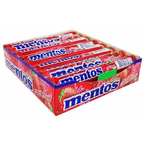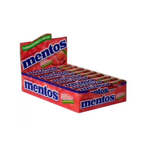 Balas mastiváveis Mentos sabor Frutas Vermelhas com 37,5 gramas cada (14 balas). Contém 16 unidades (drops). Peso líquido 600 gramas.