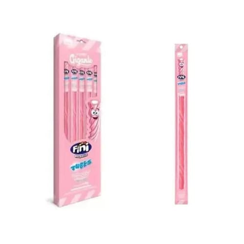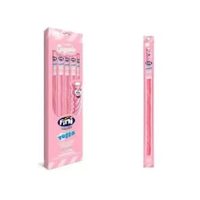 Bala de gelatina Fini Super Gigante sabor artificial de iogurte de morango e nata com 27 gramas cada, comprimento de aproximadamente 35 centímetros. Caixa contendo 24 unidades. Peso líquido total 648 gramas.