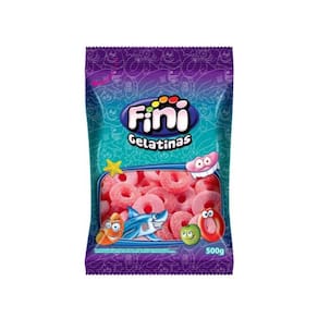 Balas de gelatina Fini Aros de Morango. Colorido e aromatizado artificialmente. Peso líquido 500 gramas.