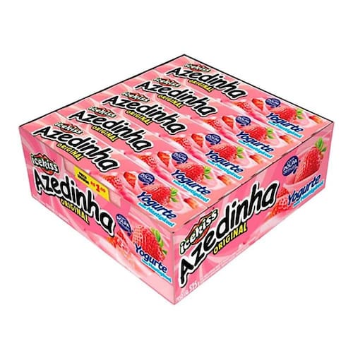 Bala mastigável Icekiss Azedinha sabor Yogurte com 35 gramas cada. Caixa contendo 15 unidades. Colorida artifialmente. Contém aromatizante sintético idêntico ao natural. Peso líquido total 525 gramas.