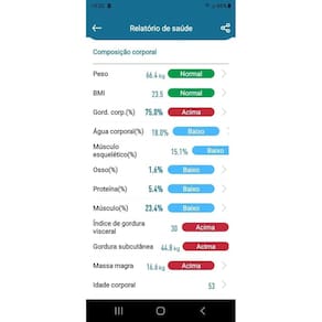 Balança Bioimpedância Gordura Corporal Peso Imc Musculatura A Balança de Bioimpedância Mini oferece diversos resultados para um acompanhamento mais eficaz dos dados sobre o seu corpo, de forma simples e fácil via aplicativo para iOS e Android em seu Smartphone, e assim ter um controle maior sobre sua saúde. Para fazer o download e começar a utilizar o aplicativo não é necessário possuir a balança. Você pode fazer o registro do seu peso e altura manualmente.