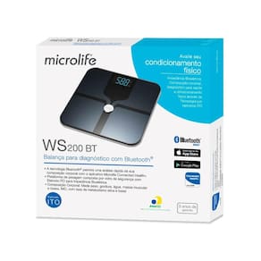 Balança de BioImpedância com Bluetooth WS200 Microlife - Balança de bioimpedância para diagnóstico corporal com Bluetooth Microlife - Cor: Preto/ Grafite - Plataforma de vidro com eletrodos ITO para uma melhor leitura; - Avaliação do condicionamento físico e diagnóstico da composição corporal: Mede peso, gordura, água, massa muscular e óssea, IMC, com taxa de metabolismo ativa e basal; - Conectividade via Bluetooth ao App MicrolifeConnected Health +; - Produto homologado pela Anatel nr: 16854-20-13509 Código ANATEL: 16854-20-13509 : 3 anos Marca: Não Informado