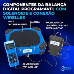 Itens inclusos: Balança digital, controle remoto, solenoide e maleta de