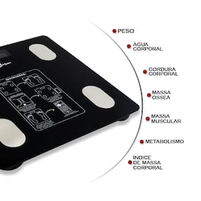 A Balança Digital Bioimpedância é ideal para você que quer cuidar da sua saúde! Você pode baixar um exclusivo aplicativo e ter em seu celular medições de:- Peso- IMC (índice de massa corporal)- BRF (taxa de gordura corporal)- Músculo- Percentual de água no corpo- BMR (taxa metabólica basal)- Gordura visceral- Taxa de proteína- Idade do corpo É alta tecnologia numa balança moderna e compacta. Possui Bluetooth, 4 sensores de alta precisão, memória para até 10 usuários e medição para peso de bebês.Compatível com Android 4.3 ou superior e IOS 8.0 ou superior. Peso máximo 180 kg Dados Técnicos: Aparelho de pesar, medir a impedância bioelétrica (bioimpedância) e avaliar a composição corporal, apresentando como resultados gráficos de diversos parâmetros, tais como: índice de massa corporal (IMC), água extracelular (ECW), massa sem gordura (FFM), massa gorda (FM), massa muscular do esqueleto (SMM) e gordura visceral (VAT), informando ainda idade do corpo, proteína, massa óssea, taxa metabólica basal (TMB). O equipamento utiliza 4 (quatro) eletrodos de toque e possui uma base de dimensões de 26 x 26 x 2,15 cm e peso de 1 kg com tela display de LCD 7,4 x 2,8 cm. Composição: Vidro Temperado. Peso máximo do usuário 180 Kg. Alimentada por 2 pilhas AAA (palito).
