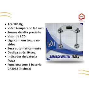 - capacidade para até 180 kg - vidro temperado 0,6 mm - sensor de alta precisão - visor de lcd - liga com um toque no vidro - zera automaticamente - desliga após 10 seg. - indicador de bateria fraca - funciona com 1 bateria cr2032 Marca: Não Informado