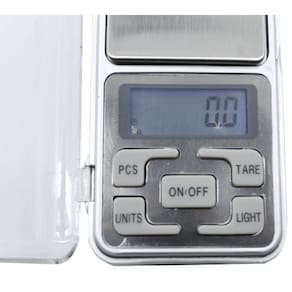 Escala de peso em Gramas : 0,1 a 0,500 gramas Capacidade Máxima de 500 gramas Auto Calibração; Visor em Cristal Líquido Azul; Tamanho Visor: 36 x 13 mm; Tampa protetora em Acrílico; Base de peso em Aço Inox. Desliga automaticamente após 30 segundos sem uso; Recurso de Tara; Alimentação: 02 Pilhas AAA inclusas ; Pesagem: G, oz, ct, gn; Dimensões: 6x2x12cm CxAxP ; Plataforma de pesagem: 5cm x 5,5cm.